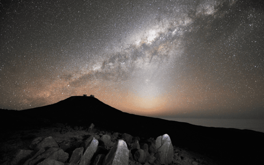 Thanks to the exceptional quality of the Chilean sky, the stars shine with a rare intensity, visible even near the horizon, just 12 km from the Pacific Ocean. The Observatory details the elements of this panorama: the central bulge of the Milky Way emerges as the most radiant area, crossed by dark lanes of cosmic dust. The galactic center is intersected by the zodiacal light, which outlines the Earth’s orbital plane — where planets and constellations align perfectly. Unbelievable, isn’t it?